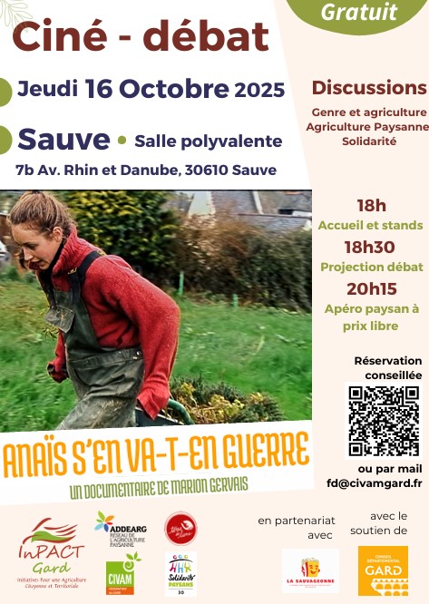 Le collectif InPact 30, en partenariat avec l'association la Sauvageonne, a le plaisir de vous inviter à la projection débat du film Anaïs s’en va-t-en guerre, de Marion Gervais le jeudi 16 octobre 2025 à partir de 18h à la salle polyvalente de Sauve (7b av. Rhin et Danube, Sauve 30610). La projection sera suivie de discussions avec des paysans et paysannes du territoire puis d'un buffet à base de produits locaux et paysans. Plus d'infos ici !