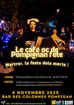 Venez découvrir la mouture 2025 de MARTROR lors du prochain café occitan de Pompignan, venez chanter ou écouter chanter, venez découvrir des lanternes, des costumes, des personnages hauts en couleur... ou en noir et blanc !